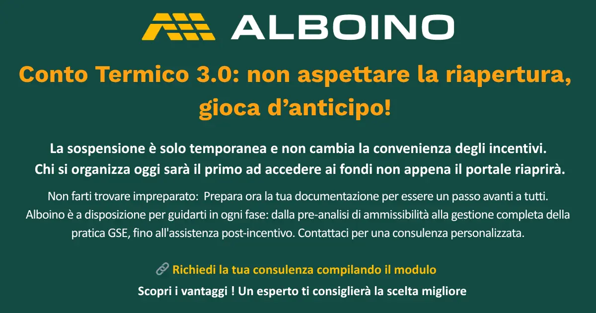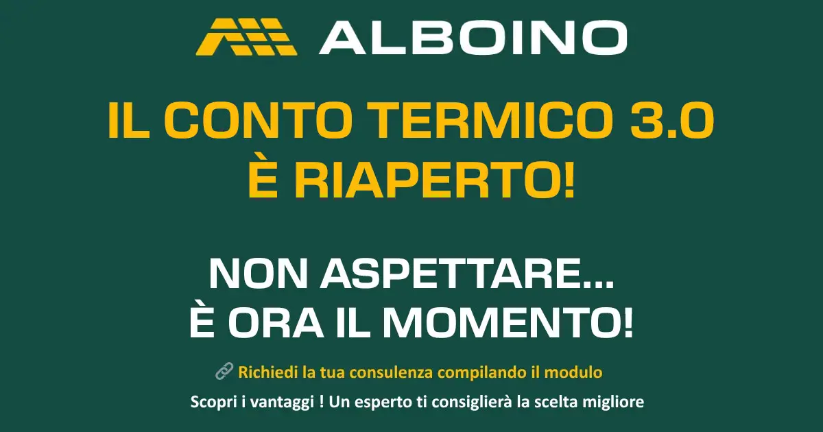 Un altro pilastro del supporto di Alboino è il Conto Termico 3.0, uno strumento incentivante gestito dal GSE che favorisce interventi di efficienza energetica e l’adozione di tecnologie a energia pulita.